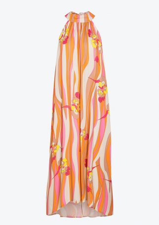 The Fawane dress is a true eye-catcher. The halter neckline and the asymmetrical cut make it a stylish and feminine piece of clothing. The print in pastel shades of pink and orange adds a retro touch to the design.