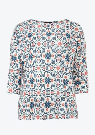 Our bohemian print is now available in a 100% linen fabric for the ultimate in easy-to-wear style. This feminine top features a boat neckline and 3/4 sleeves, making it perfect for pairing with jeans or skinny jeans.